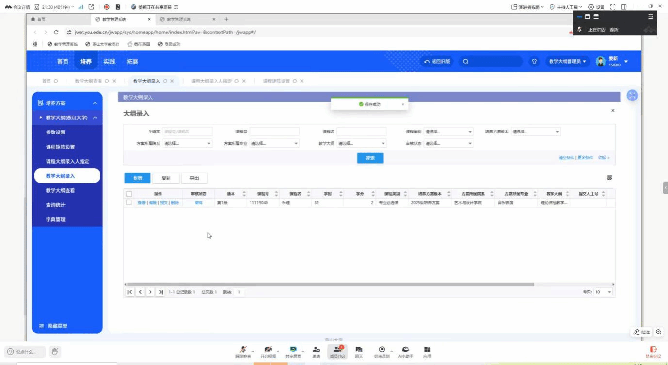 在核心培训环节,姜老师以“理论讲解 + 实操演示 + 案例剖析” 的模式,为参训教师带来全流程专业指导。针对教务管理系统的权限配置、数据对接逻辑进行了底层解读,消除了教师对系统操作的技术顾虑;随后通过屏幕共享,分步演示了从课程基础信息录入、教学目标对标,到考核方式设置、大纲审核提交的完整流程。