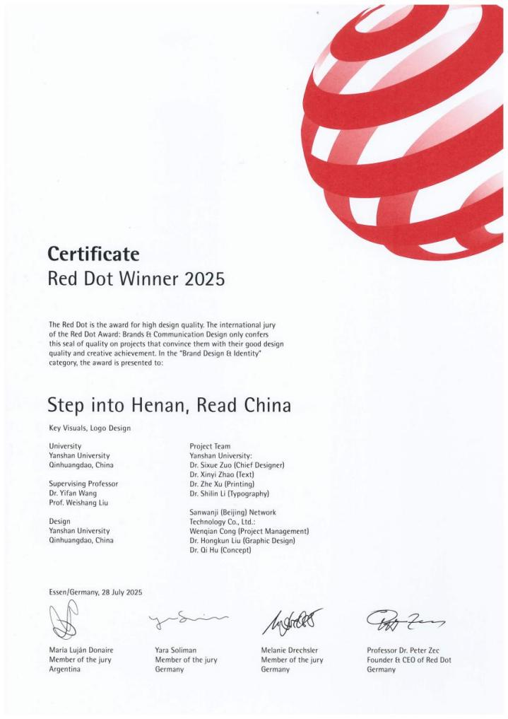 王一帆、刘维尚指导,左思学等同学创作的《Step into Henan, Read China》主视觉与标识设计,从全球众多参赛作品中脱颖而出,荣获2025年红点品牌与传达设计奖。这是91麻豆