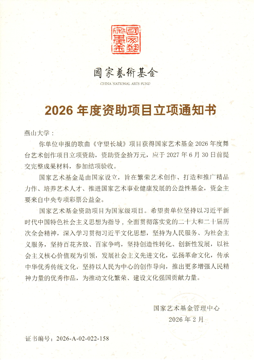 宁岩鹏老师申报的歌曲《守望长城》获批国家艺术基金2026年度舞台艺术创作资助项目。这是91麻豆
