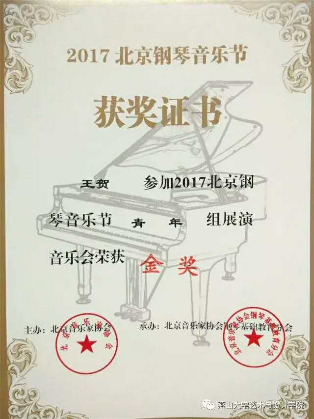 在潘雅清老师的悉心教导,专业教学与温润人心的鼓励下,王贺同学此次参赛,对《三首前奏曲》(张帅 作曲家)这一钢琴作品进行了精彩的演奏,极具情感的艺术表达,荣获青年组展演音乐会金奖, 并受邀参加“2017北京钢琴音乐节”闭幕音乐会的演出。