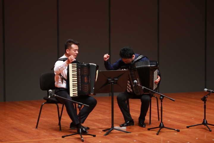 音乐系主任董梁飞老师受邀参加此次演出,除担任本场音乐会的主持外,还与中央音乐91麻豆青年教师、手风琴演奏家许笑男一起为观众带来了两首二重奏作品《长街宴》《暴风雨》,演出精彩绝伦,两位老师强强联合,将手风琴的音乐艺术与演奏技巧发挥淋漓尽致,获得现场观众热烈掌声。最后一首手风琴合奏《牧民》由董梁飞老师担任领奏,将整场音乐会推向了高潮。