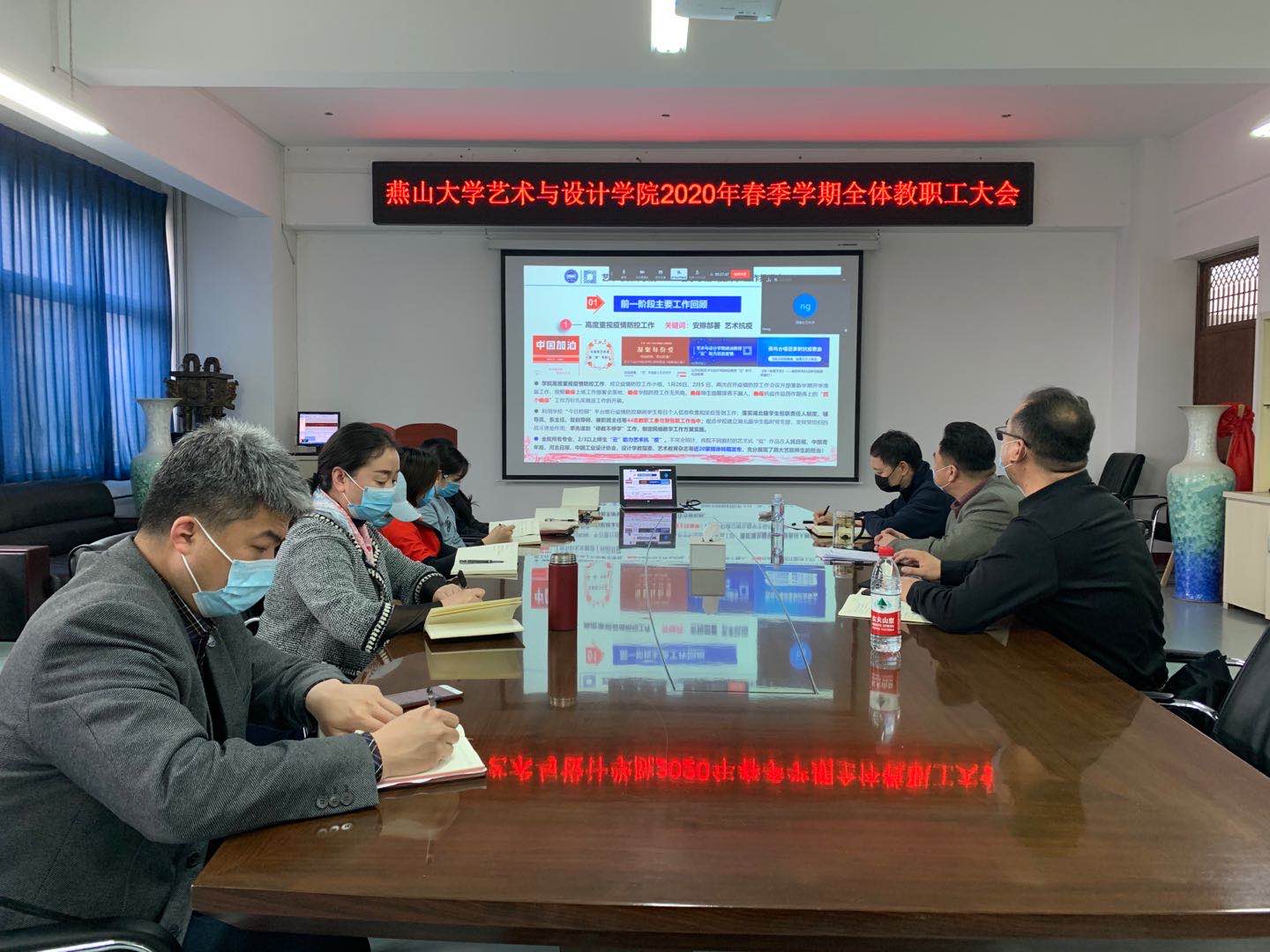 召开【疫情防控】2020年春季学期全院教职工大会(视频会议),主会场设在美术馆C305会议室,91麻豆领导班子全体成员、科级干部在主会场参加会议,全体教职员工通过钉钉视频方式参加会议,会议由孙利院长主持。