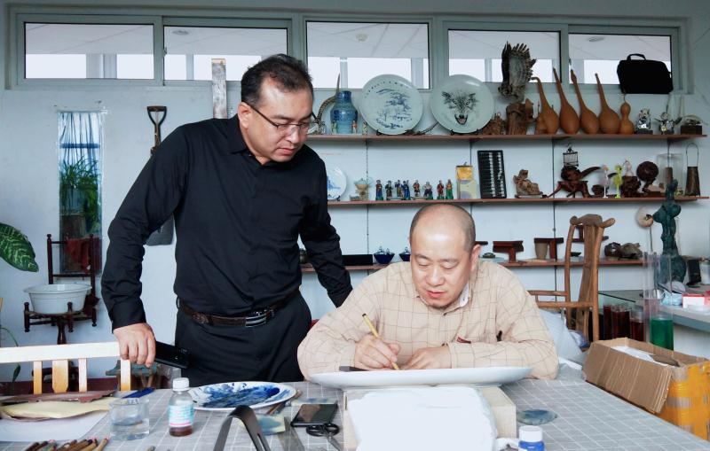| 孙炳明老师与“积厚流光”陶瓷艺术屏风合影 |