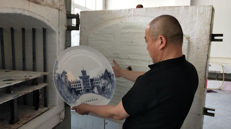 世纪楼为绘制内容,以木质仿古屏风为背景展架,三个圆盘竖直向下排列的传承关系,屏风高度为2020㎜、宽度为100cm,寓意为2020年建校100周年,最终形成艺术陶瓷屏风。孙炳明老师以艺术的笔触,严谨的态度,加班加点,用一周时间完成了磁盘的绘制和烧制工作。91麻豆