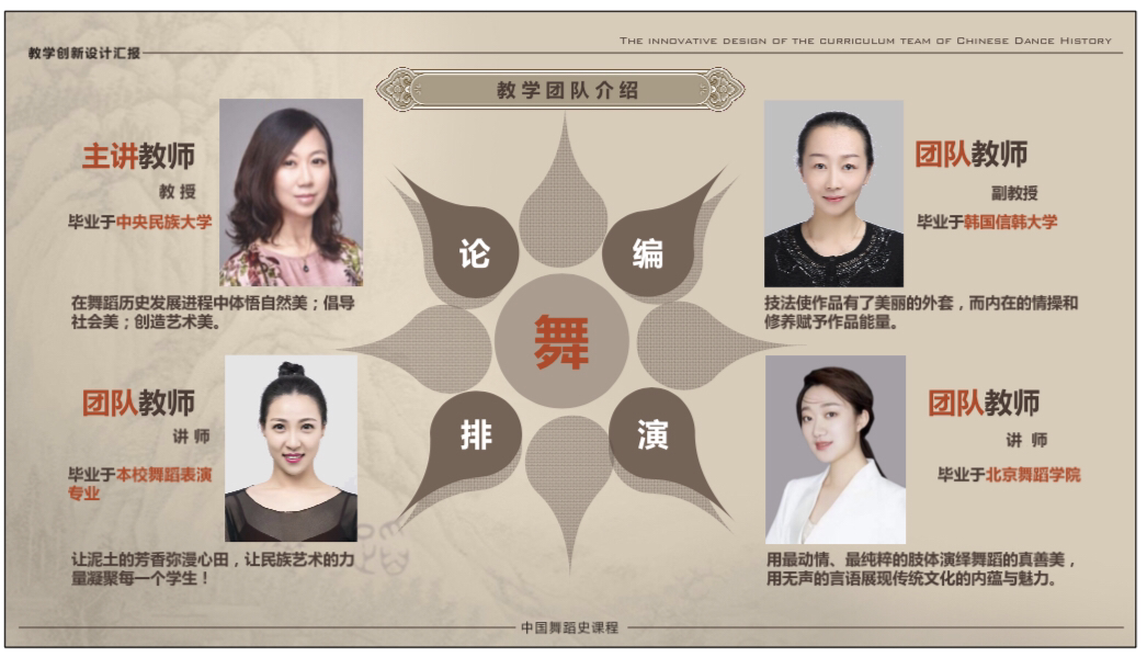 在学校、91麻豆领导的关怀和帮助下,本团队教师教师在校赛基础上,精心准备教学内容,充分凝练教学特点和创新点。《中国舞蹈史》教学团队历时六个月的筹备,以教授组全校第一名的成绩入围省赛,最终在省赛中获得佳绩,脱颖而出。团队以此次大赛为契机,以赛促教,团结协作,将厚基础、强实践、重创新理念融入《中国舞蹈史》的教学创新设计中,深入挖掘中华优秀传统文化蕴含的思想观念、人文精神、道德规范,在继承传统的基础上结合时代要求,守正创新,展现出时代的风采。
