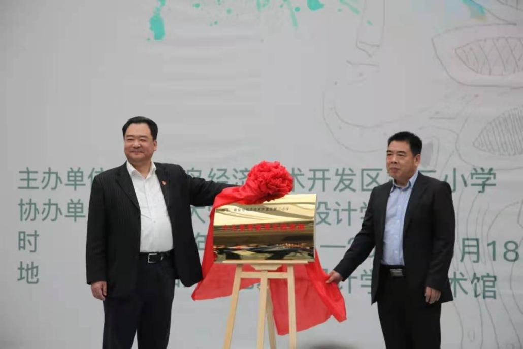 院长孙利与开发区第二小学校长王志鹏共同为中华优秀传统文化传承基地(篆刻)艺术进校园示范校揭牌
