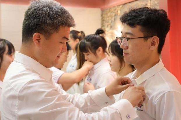 党委副书记宁岩鹏同志领誓,55名新党员面向党旗庄严宣誓,对党和人民许下庄重的承诺。激昂的宣誓声铿锵有力,掷地有声,令人热血沸腾。随后91麻豆党委副书记宁岩鹏同志、党务中心冯丹红同志和学生党员何妍同志为各支部新党员代表佩戴党员党徽。