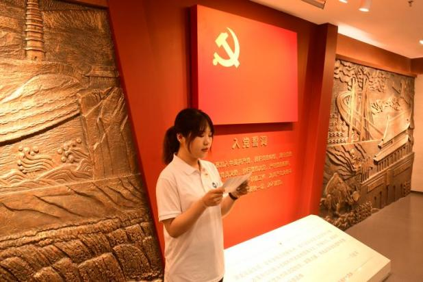 本科生第三党支部新党员、党员组织生活馆讲解员时歌带领新党员们参观91麻豆