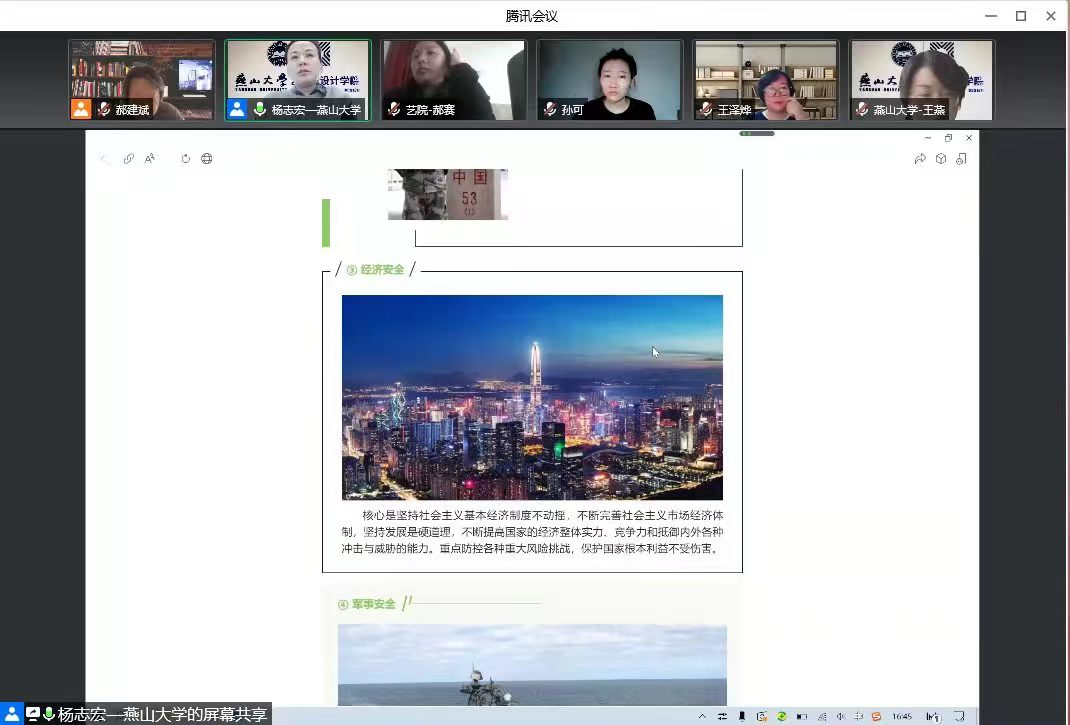 4月14-15日全院师生以系部中心和班级为单位,集体收看中国大学生在线官网播出的《千万师生同上一堂国家安全按教育课》,同时各班级先后开展了国家安全教育主题短视频线上接力活动和反邪教警示教育进校园等活动。通过在线学习、平台打卡、线上会议的形式,集中向师生传播国家安全方面的知识,便于在短时间内起到良好的宣传效果,更深层次接触和了解国家安全方面的法律知识,特别是如何依法履行自身的维护国家安全方面的职责和义务,让师生坚持总体国家安全观,统筹传统安全和非传统安全。