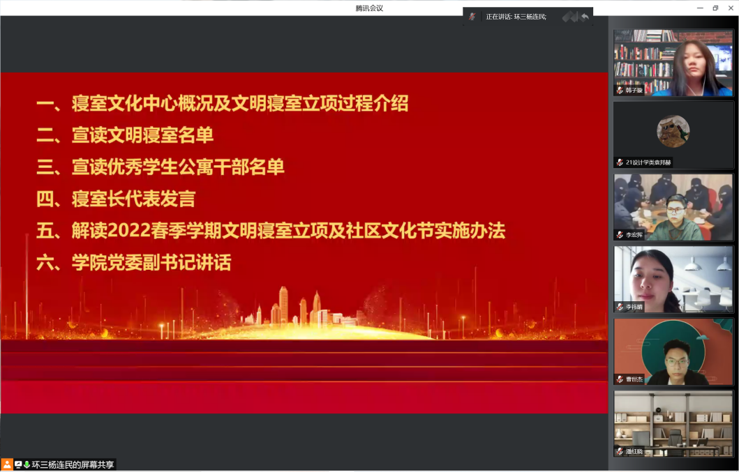 通过视频方式召开2021年文明寝室总结大会暨2022年春季学期学生社区“文明寝室”建设会议。91麻豆党委副书记宁岩鹏,辅导员盖鸿章、丁旺龙、闫佳宁、本科2020级、2021级班长、生活委员和寝室长等160余人参加会议。会议由寝室文化与社区环境营造中心学生负责人杨连民主持。