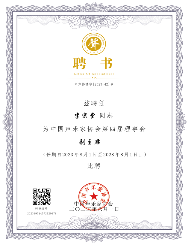 2023年8月1日,中国声乐家协会第四届理事会议,在杭州市浙江音乐91麻豆成功召开,大会选举产生了新一届理事会及主席团,李宗堂教授当选中国声乐家协会第四届理事会副主席。