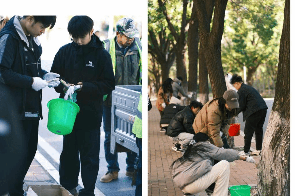 活动现场,后勤服务中心的老师傅们对树林的品类逐一介绍、对相关养护知识详细讲解,认真指导学生们如何操作,每个步骤的注意事项。同学们戴上手套、拿起工具,找到自己的“责任树”,兴致勃勃行动起来。同学们在老师傅们的指导下,不知不觉间,一棵又一棵树木被养护,同学干的热火朝天。一路而下,校园主干路段的树木粉刷一新。当一排排大树粉刷养护后,同学们纷纷转身回望,成就感油然而生。