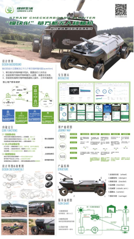 该设计适用于各种地型下,人工竹林竹根遗留清理作业。在对竹资源规模化种植下,通过对遗留竹根的处理以及再应用,加快新竹的再生。这款设计造型以正方体体块为主,凸显出设备的沉稳与厚重;设备以破碎竹根并喷洒试剂的方式进行作业,加快了竹根育肥的同时解决竹根残留问题;工作端以机械臂连接的方式进行作业,多根机械臂共同作业实现设备的模块化工作;轮胎采用履带轮并增加可调节高低的传动轴,解决不同地形的问题;设备采用无人工作,减少了对人力资源的消耗。