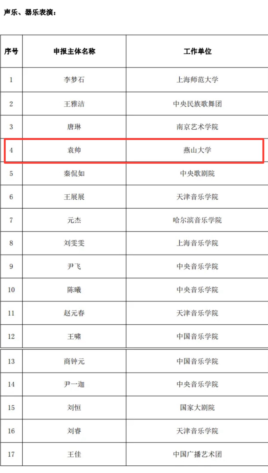 青年教师袁帅获得青年艺术创作人才器乐、声乐表演项目。
